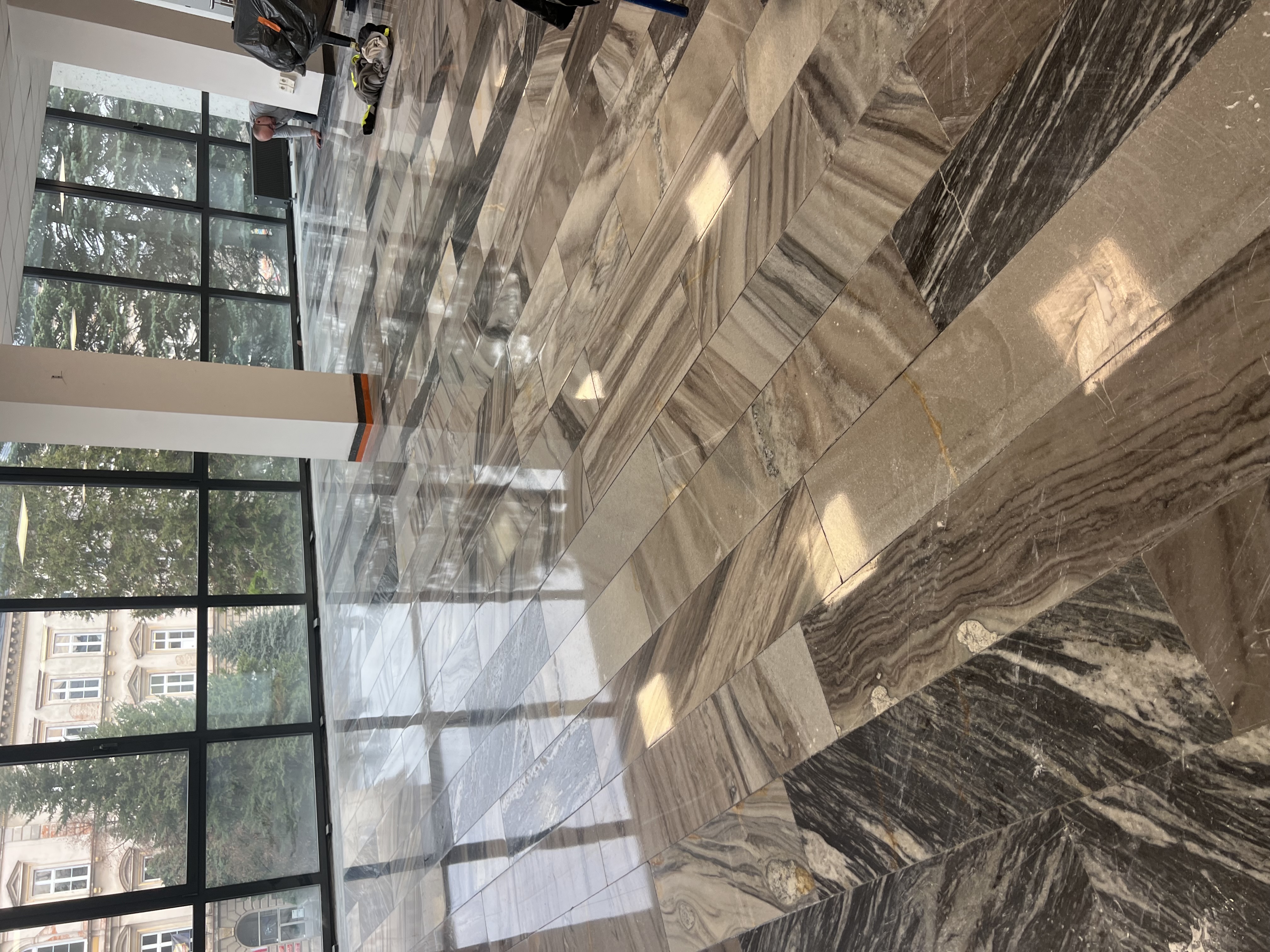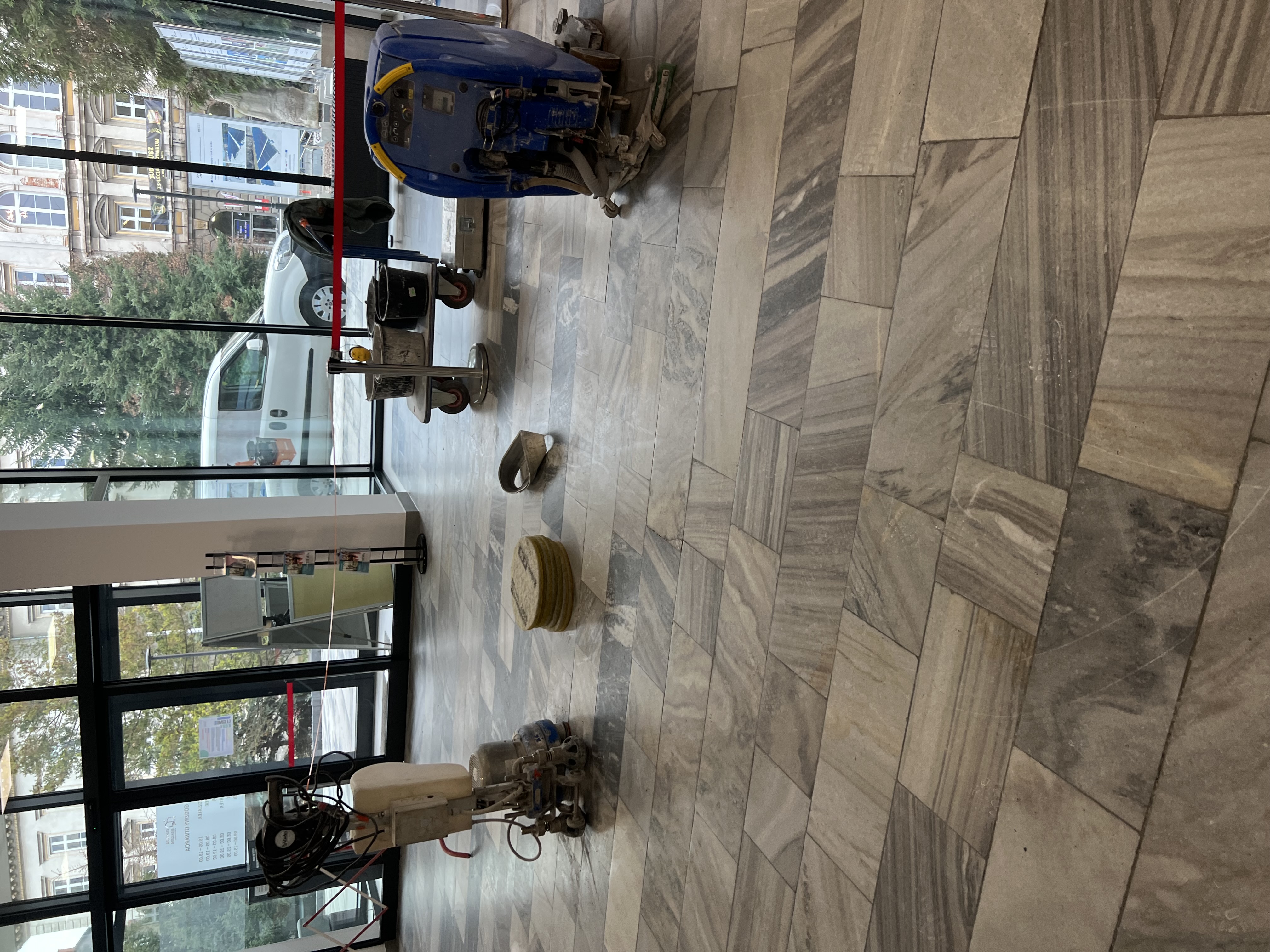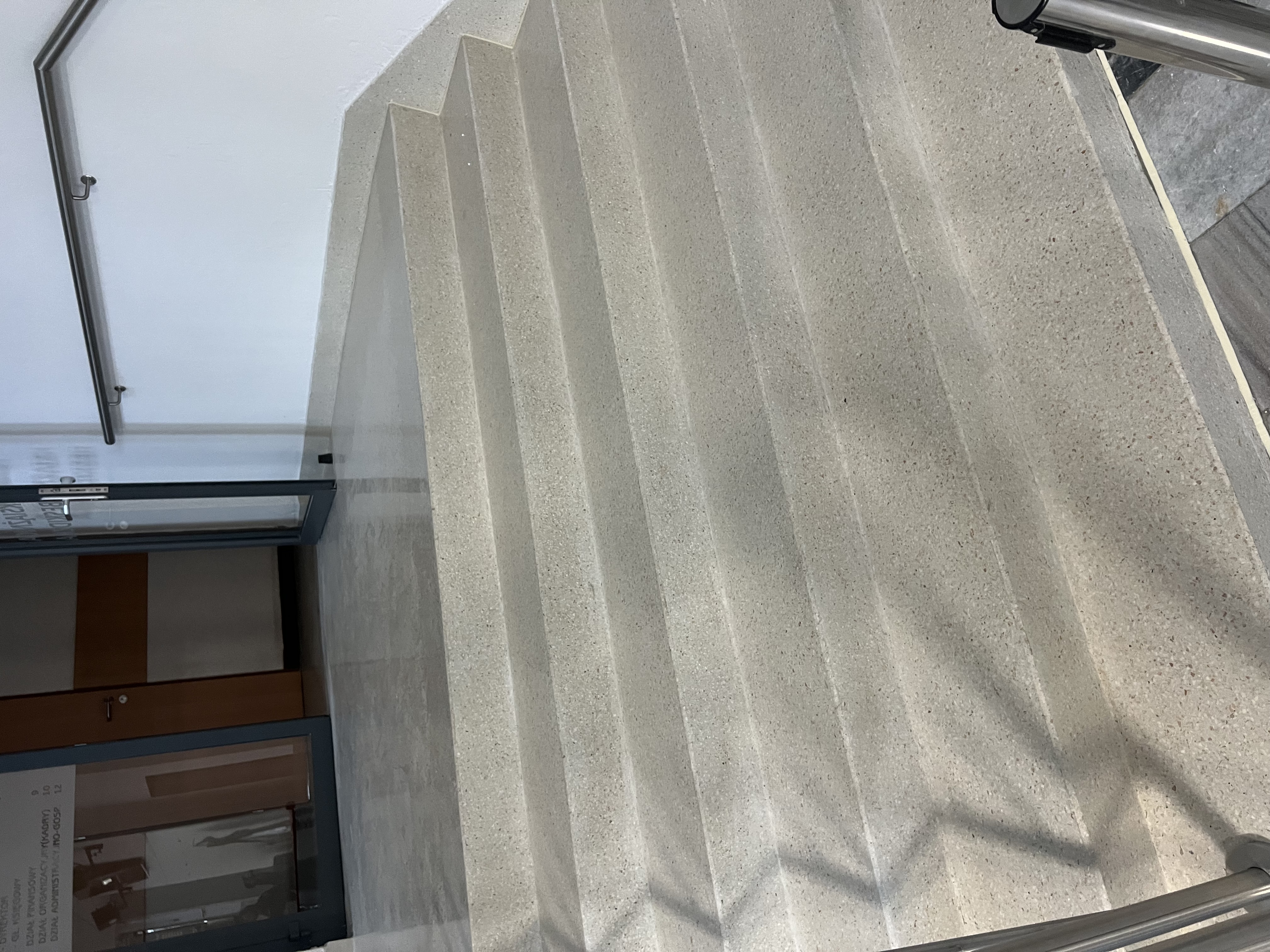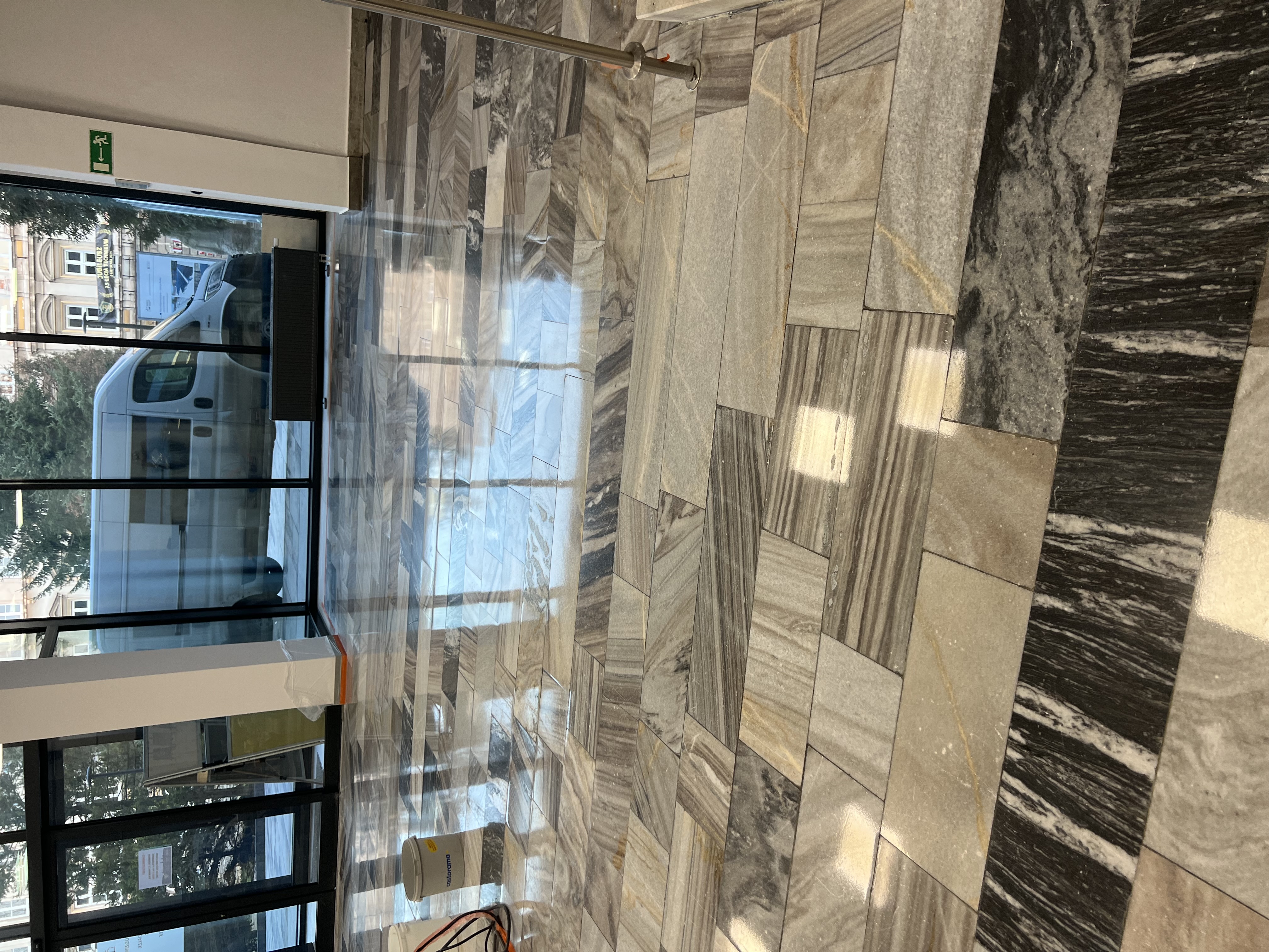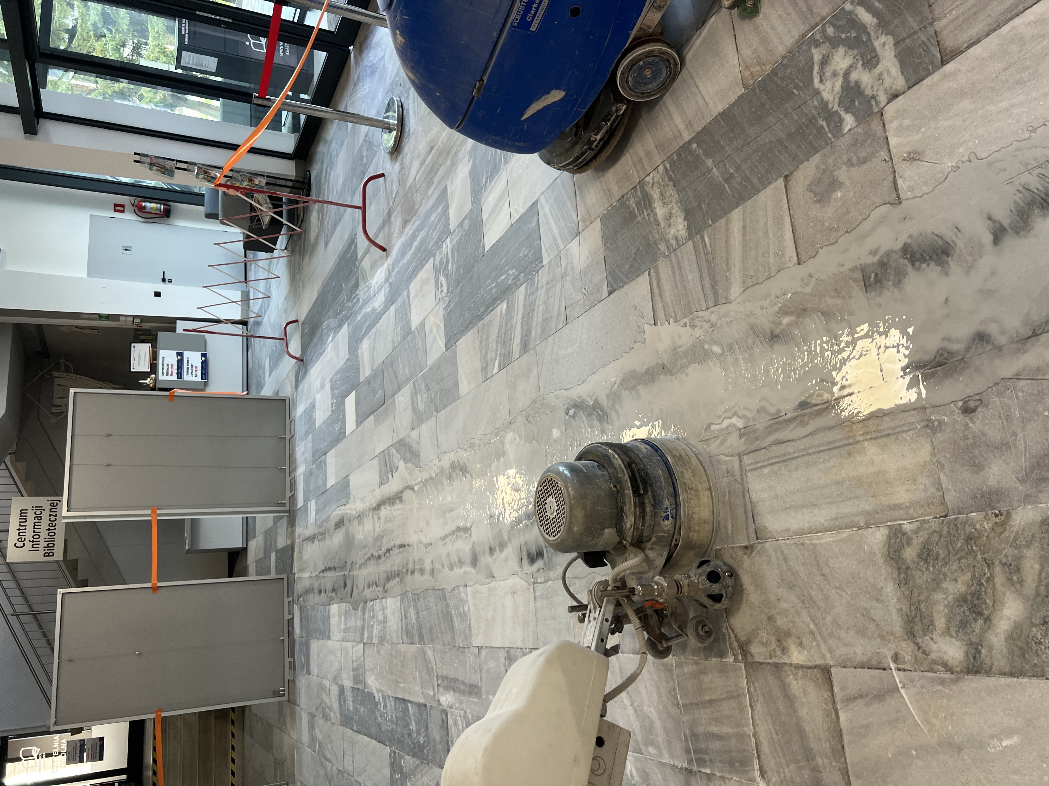Renowacja dwóch klatek schodowych wykonanych z lastryko oraz polerowanie pasami diamentowymi posadzki marmurowej, 300 m2. Prace wykonana w Książnicy Beskidzkiej - publicznej bibliotece w Bielsku-Białej.