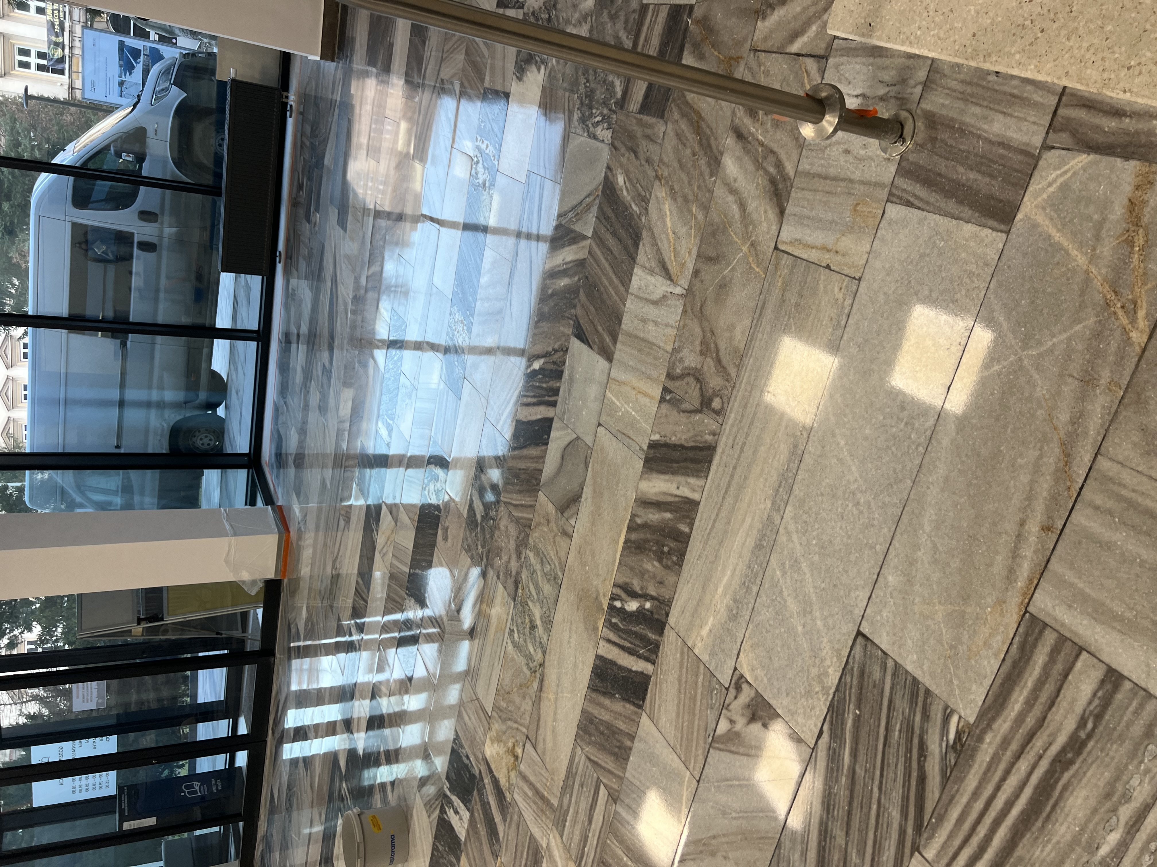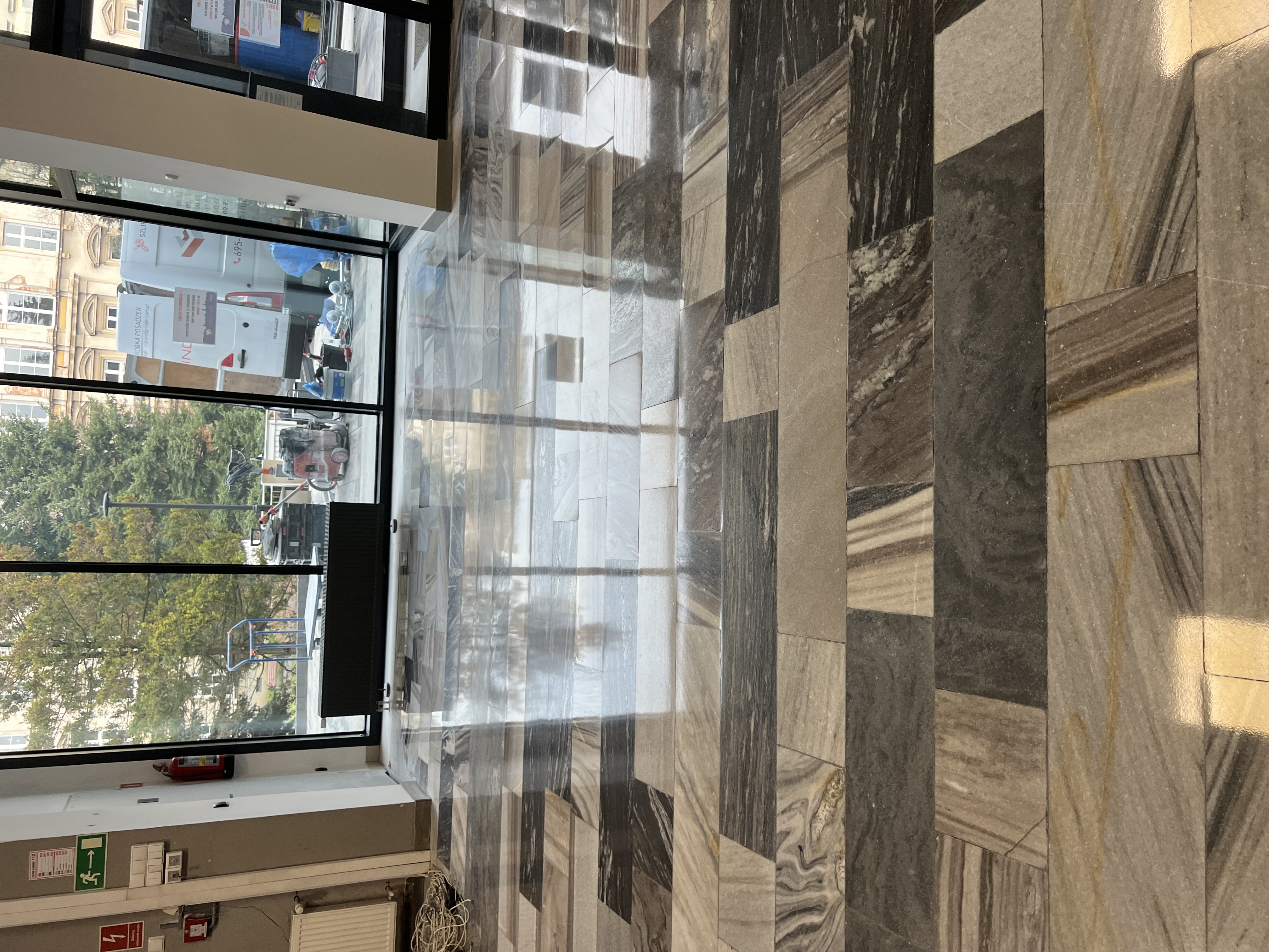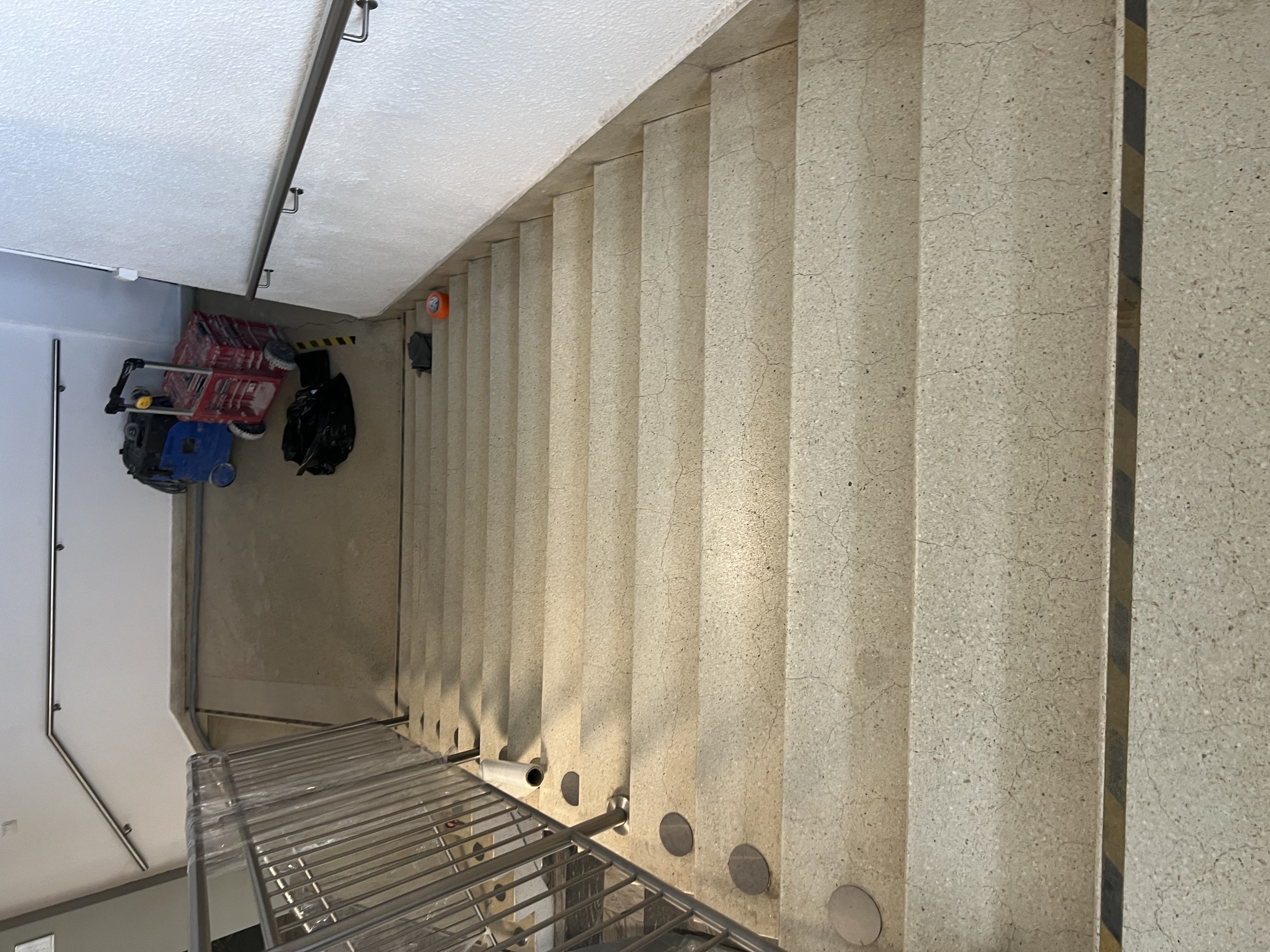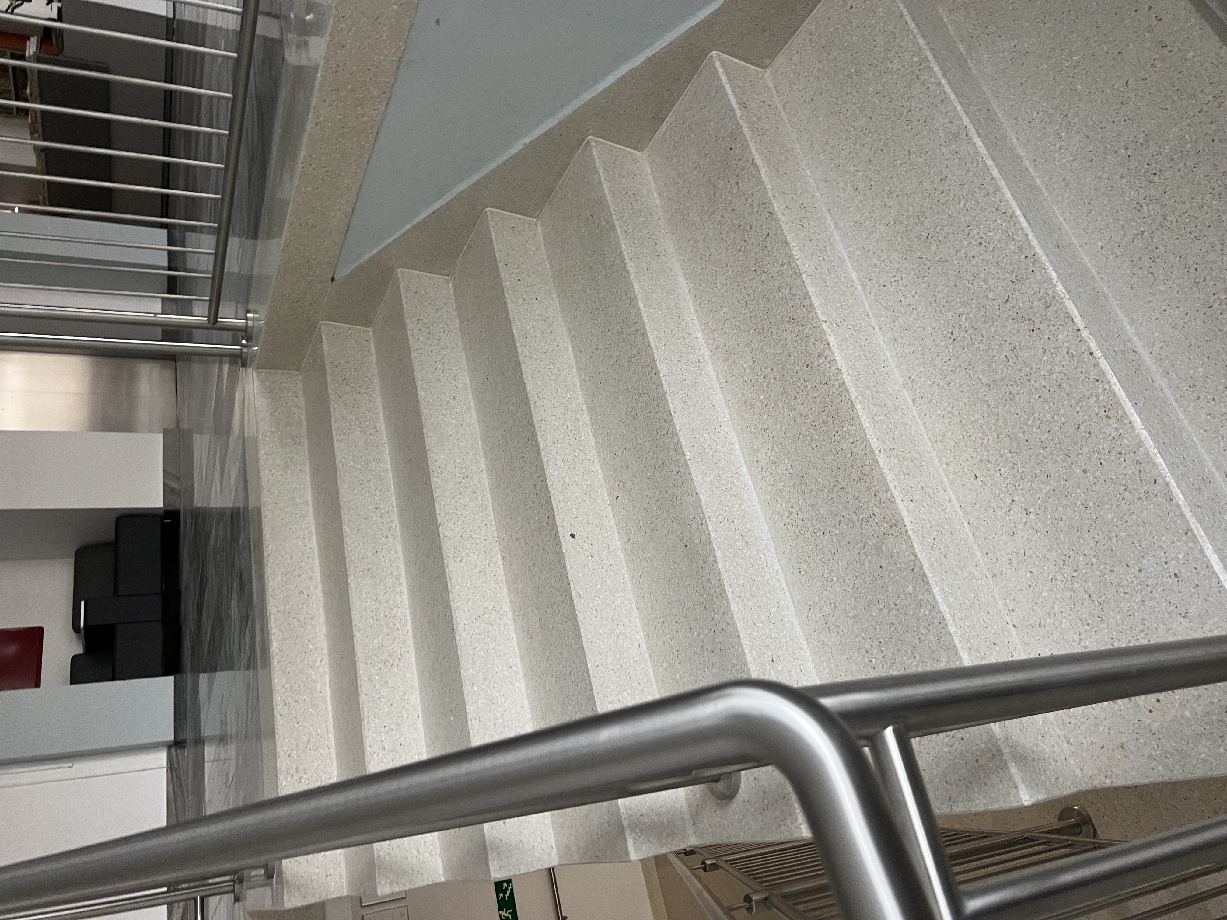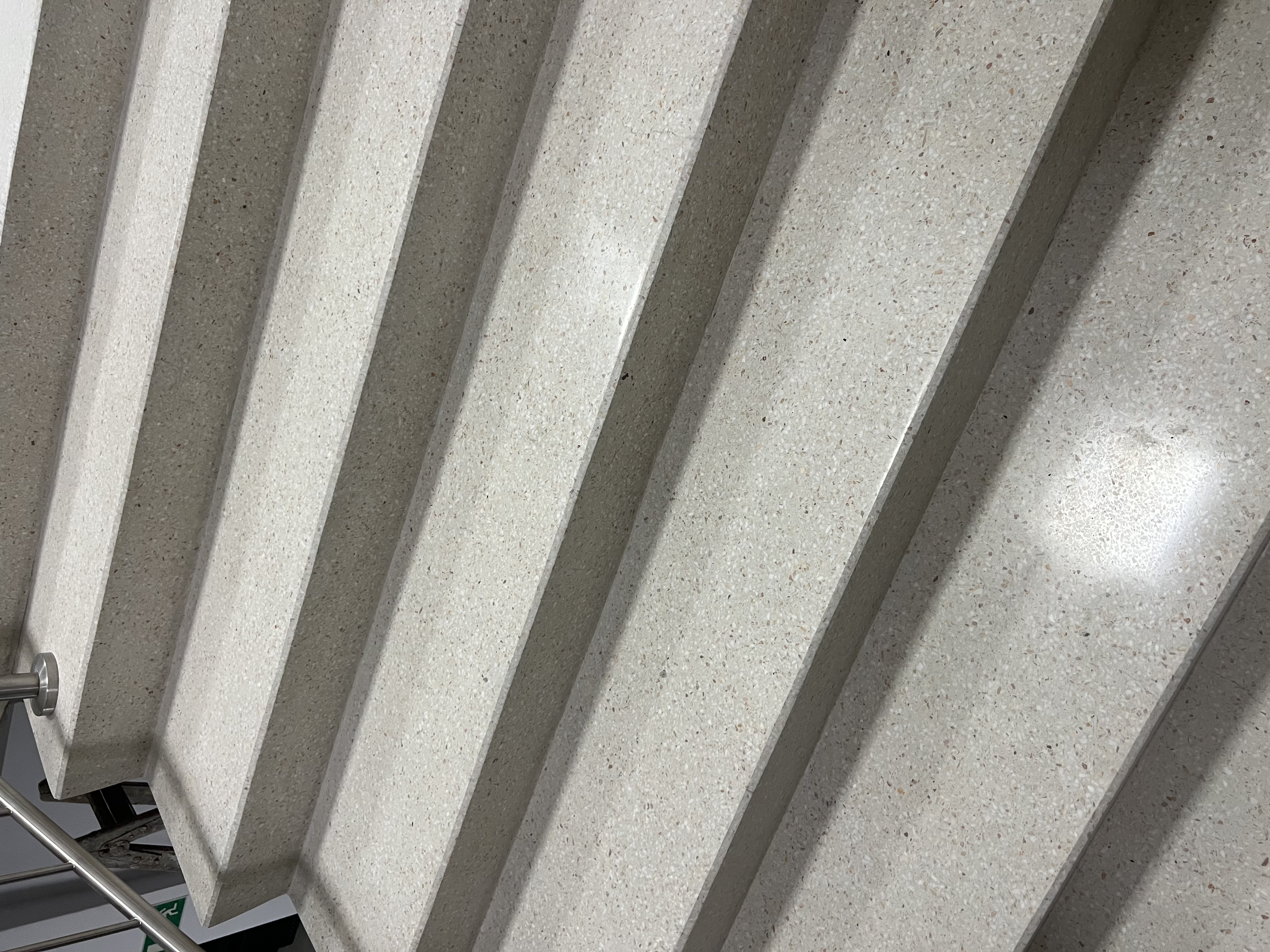 Renowacja dwóch klatek schodowych wykonanych z lastryko oraz polerowanie pasami diamentowymi posadzki marmurowej, 300 m2. Prace wykonana w Książnicy Beskidzkiej - publicznej bibliotece w Bielsku-Białej.