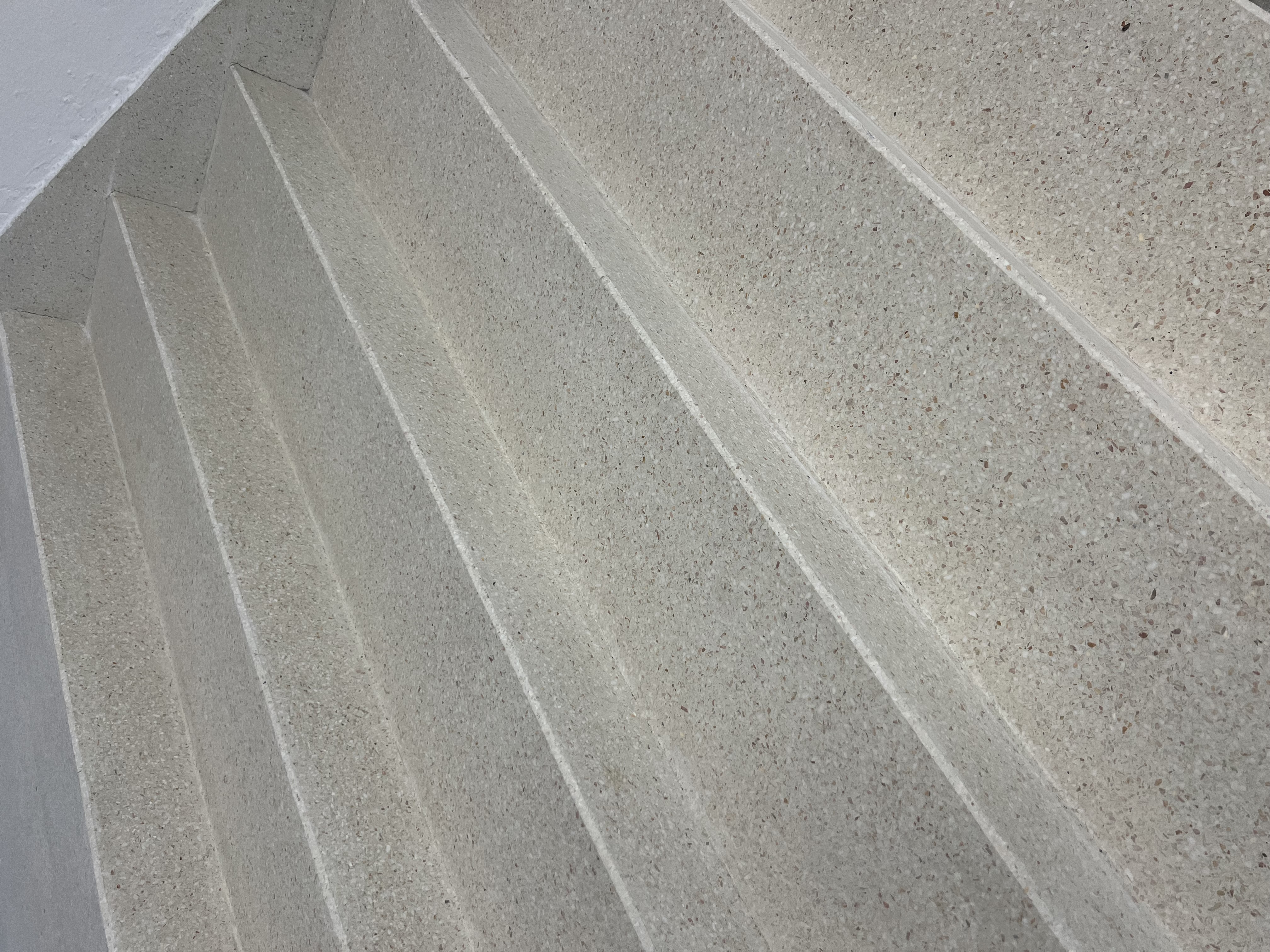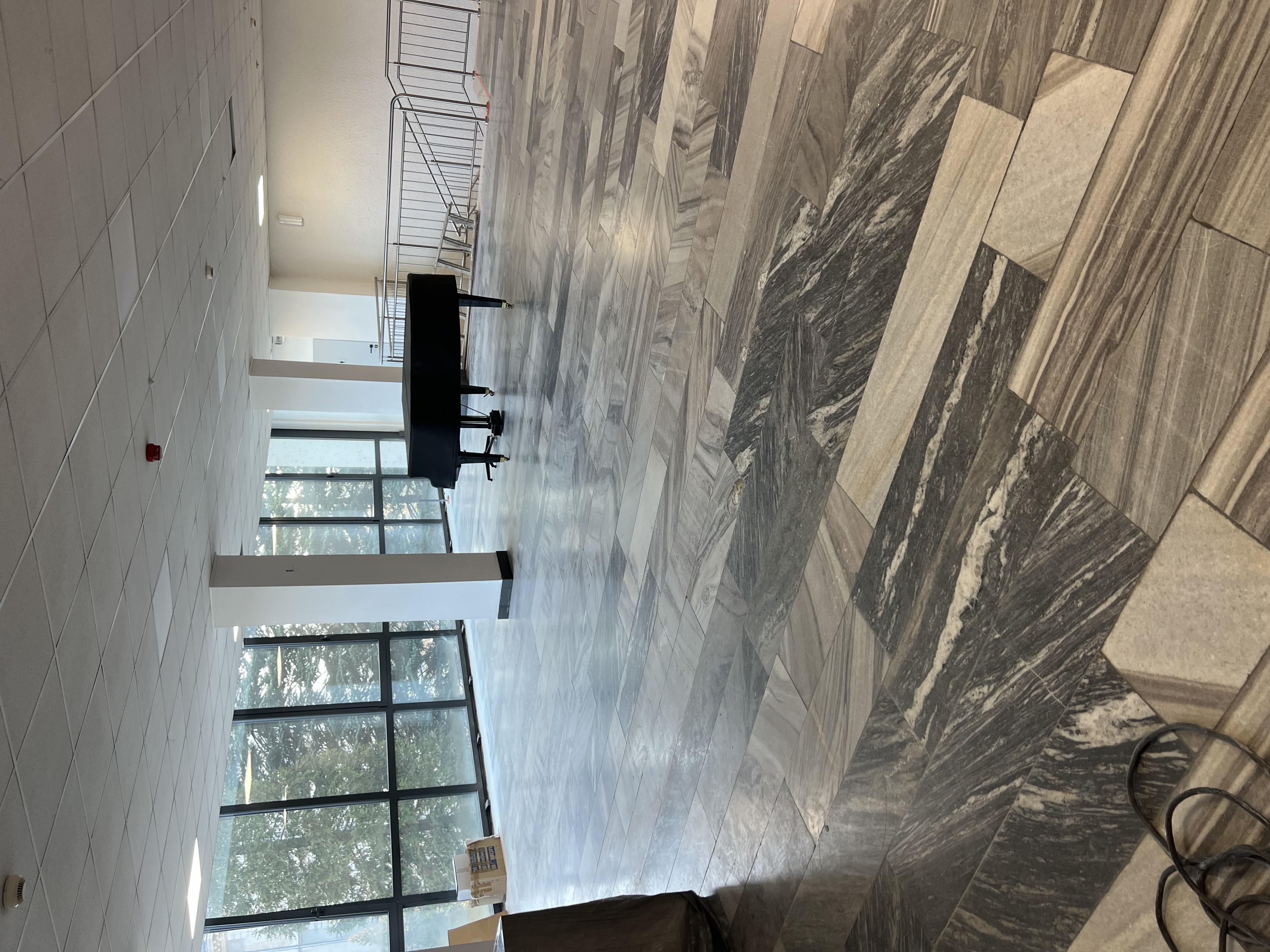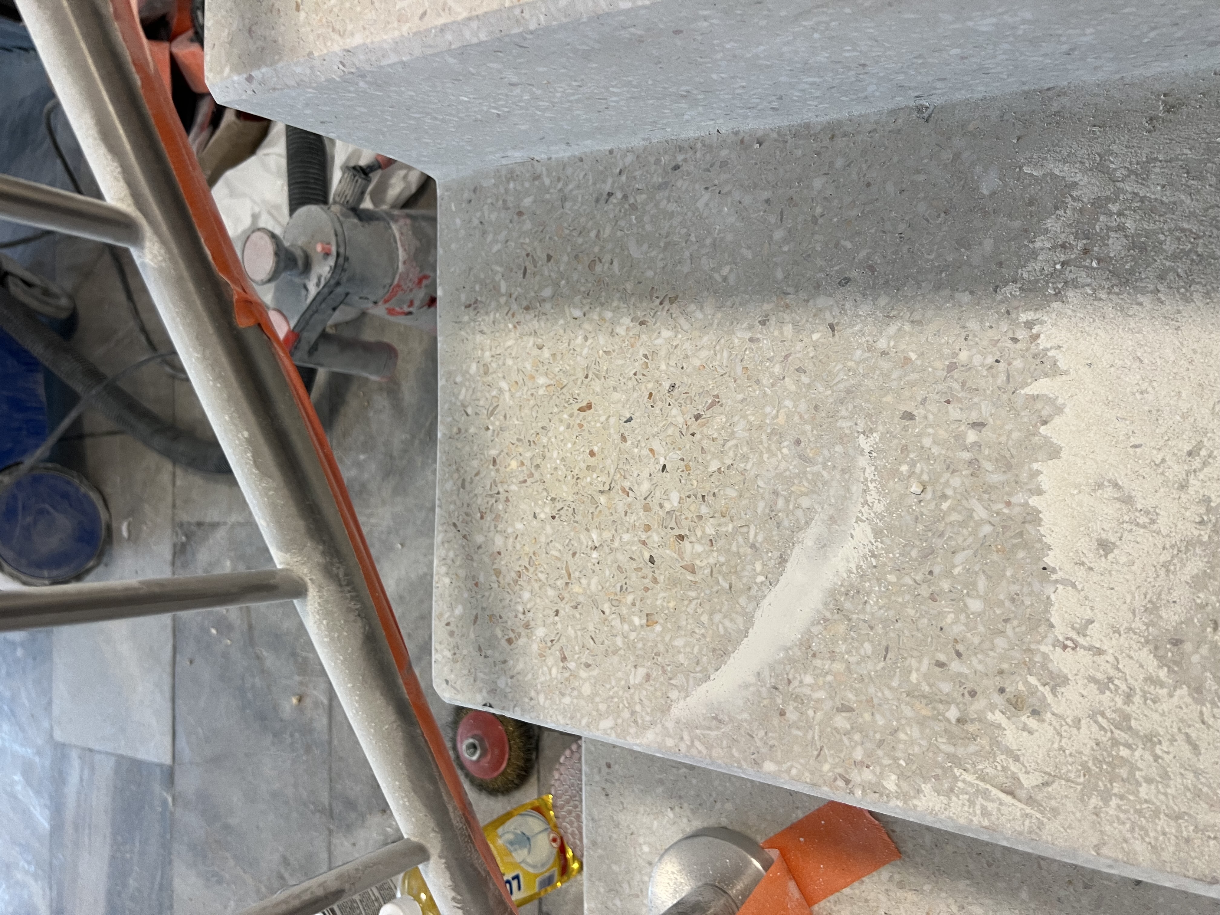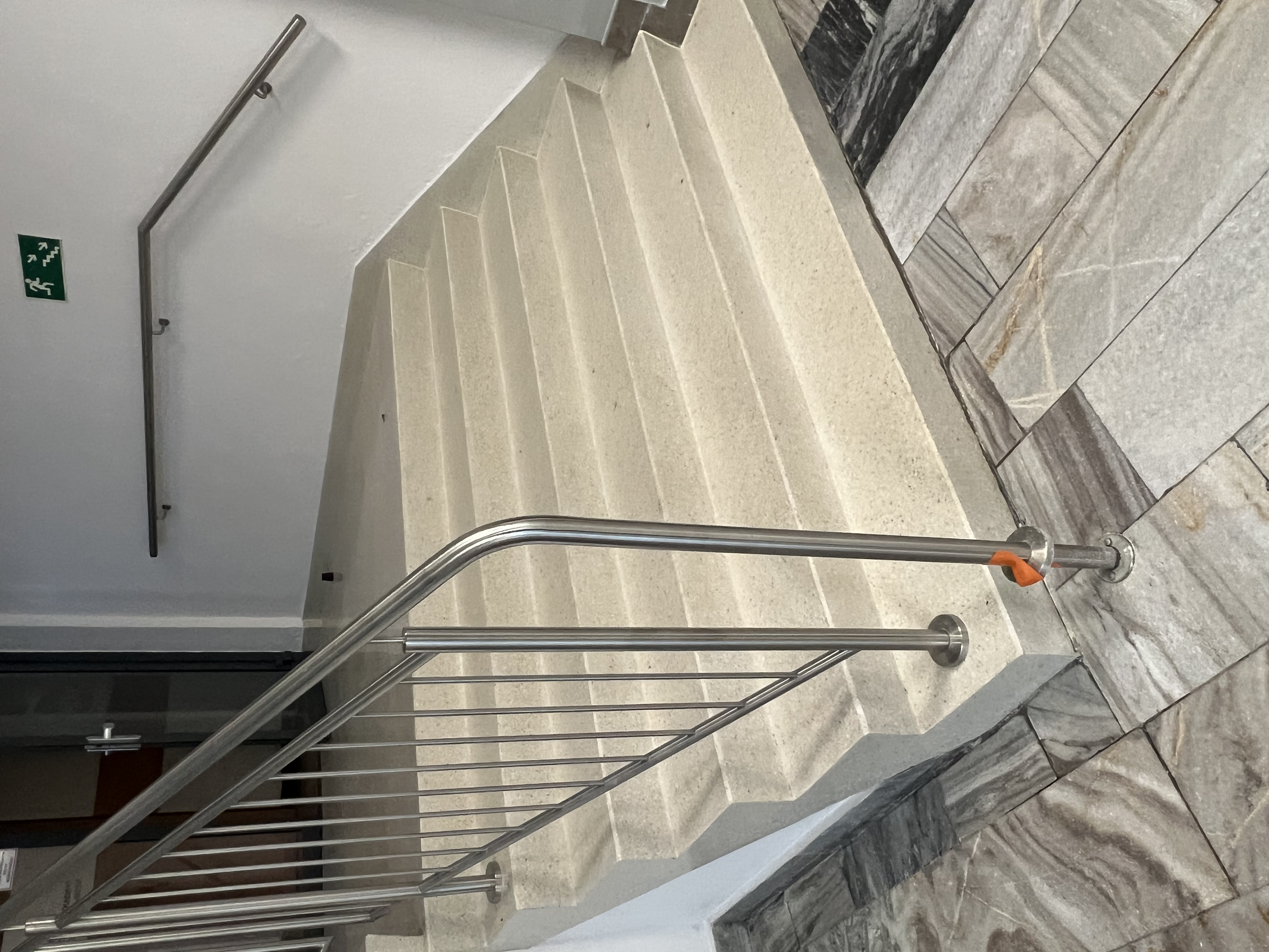 Renowacja dwóch klatek schodowych wykonanych z lastryko oraz polerowanie pasami diamentowymi posadzki marmurowej, 300 m2. Prace wykonana w Książnicy Beskidzkiej - publicznej bibliotece w Bielsku-Białej.