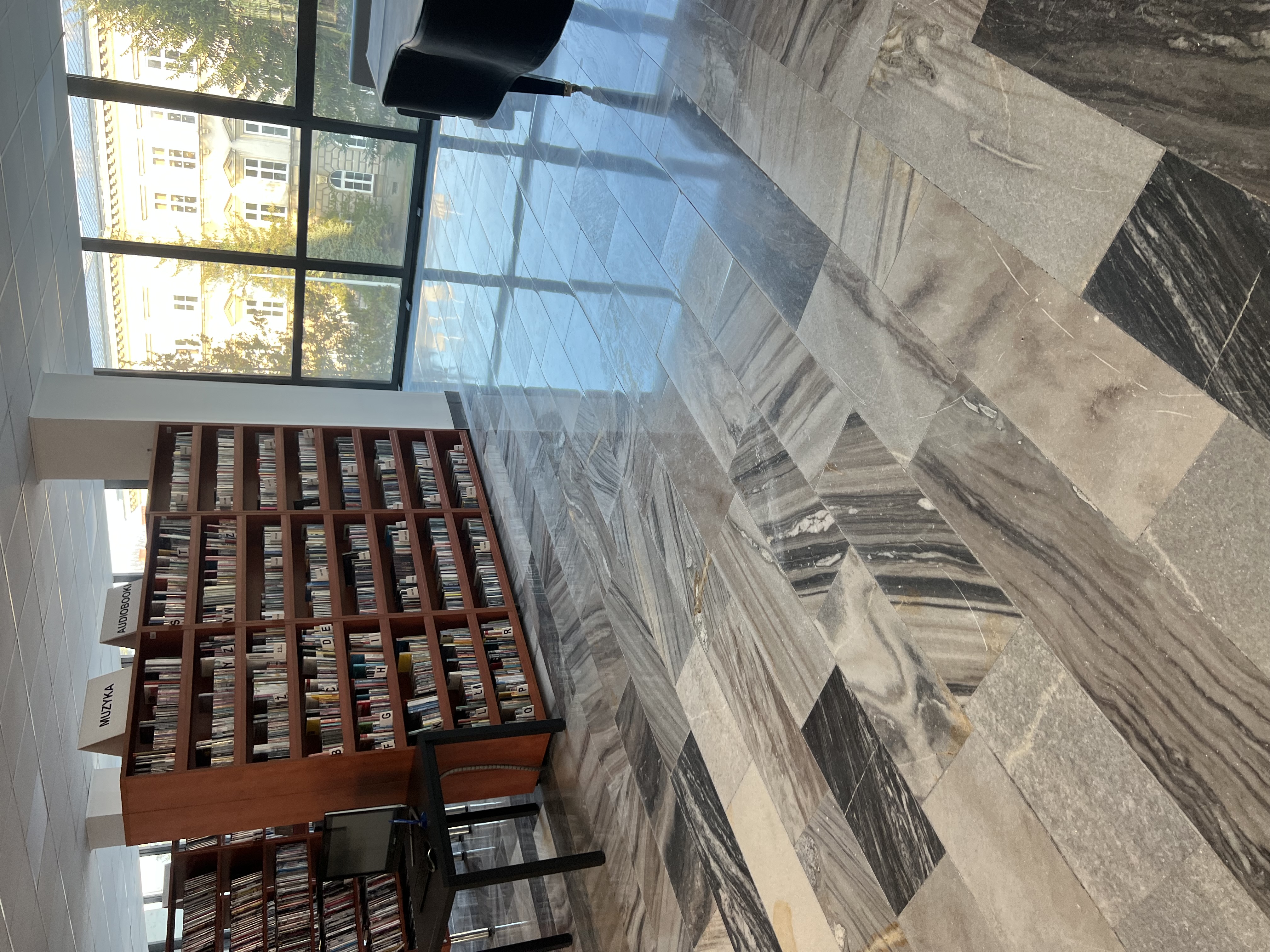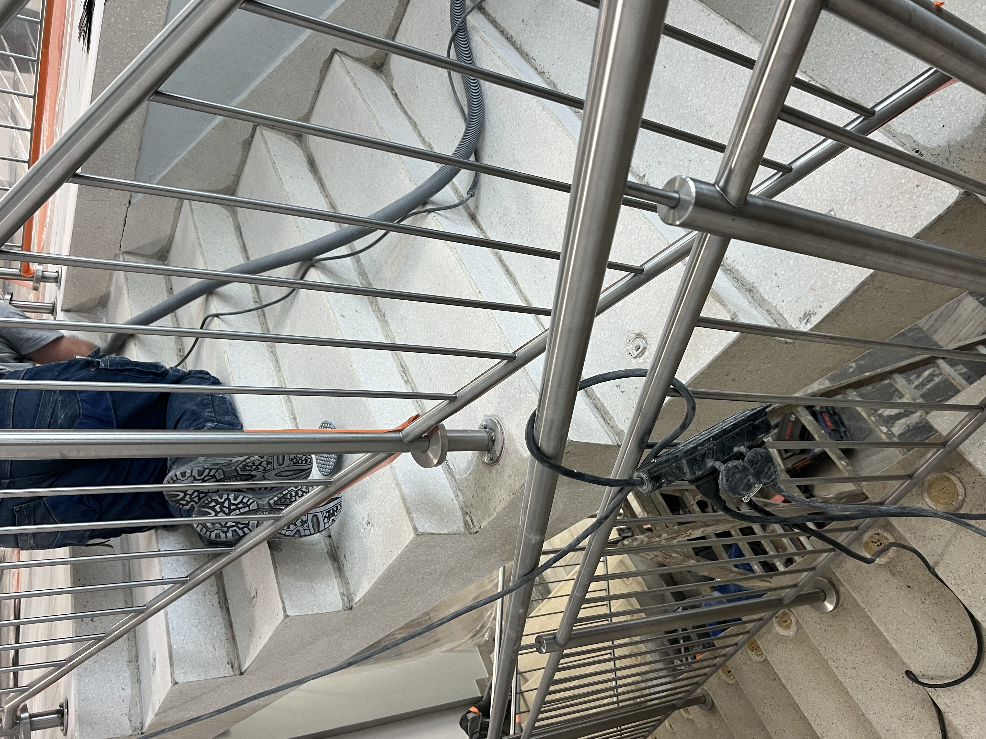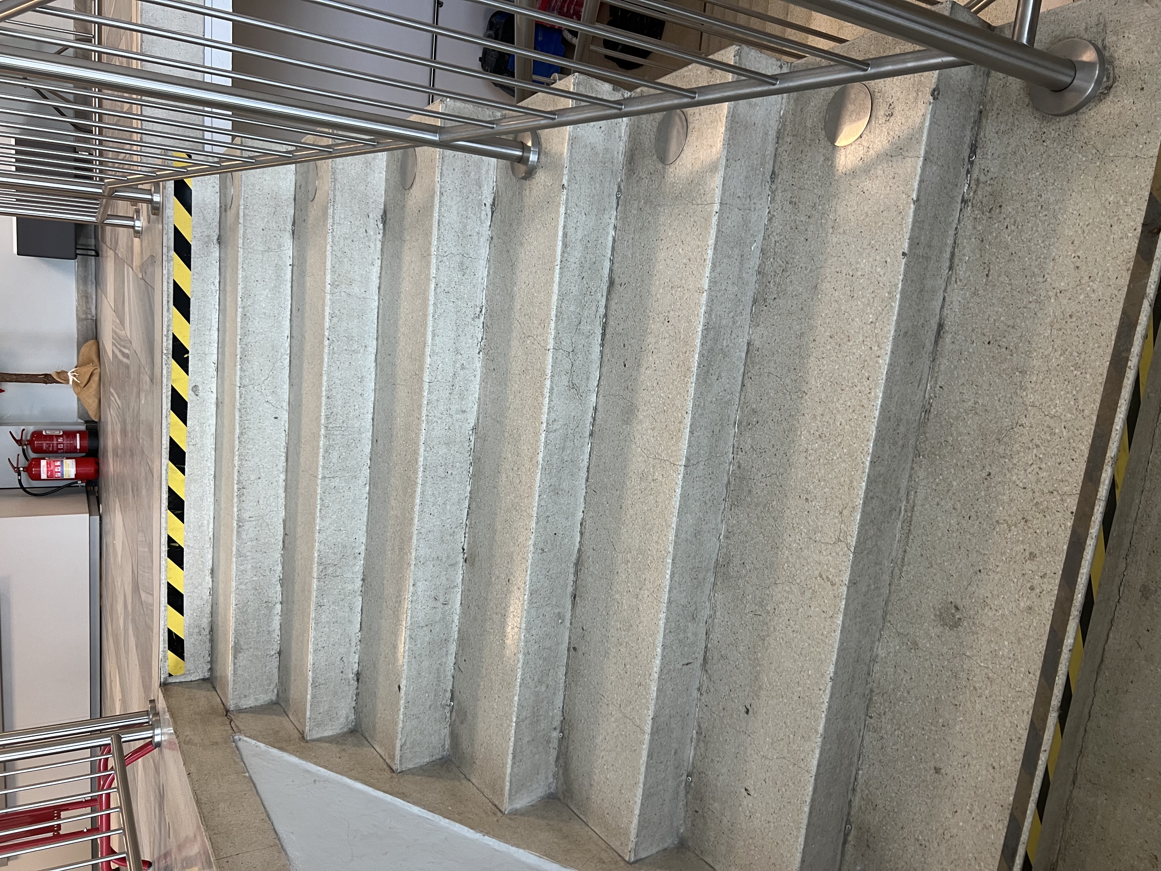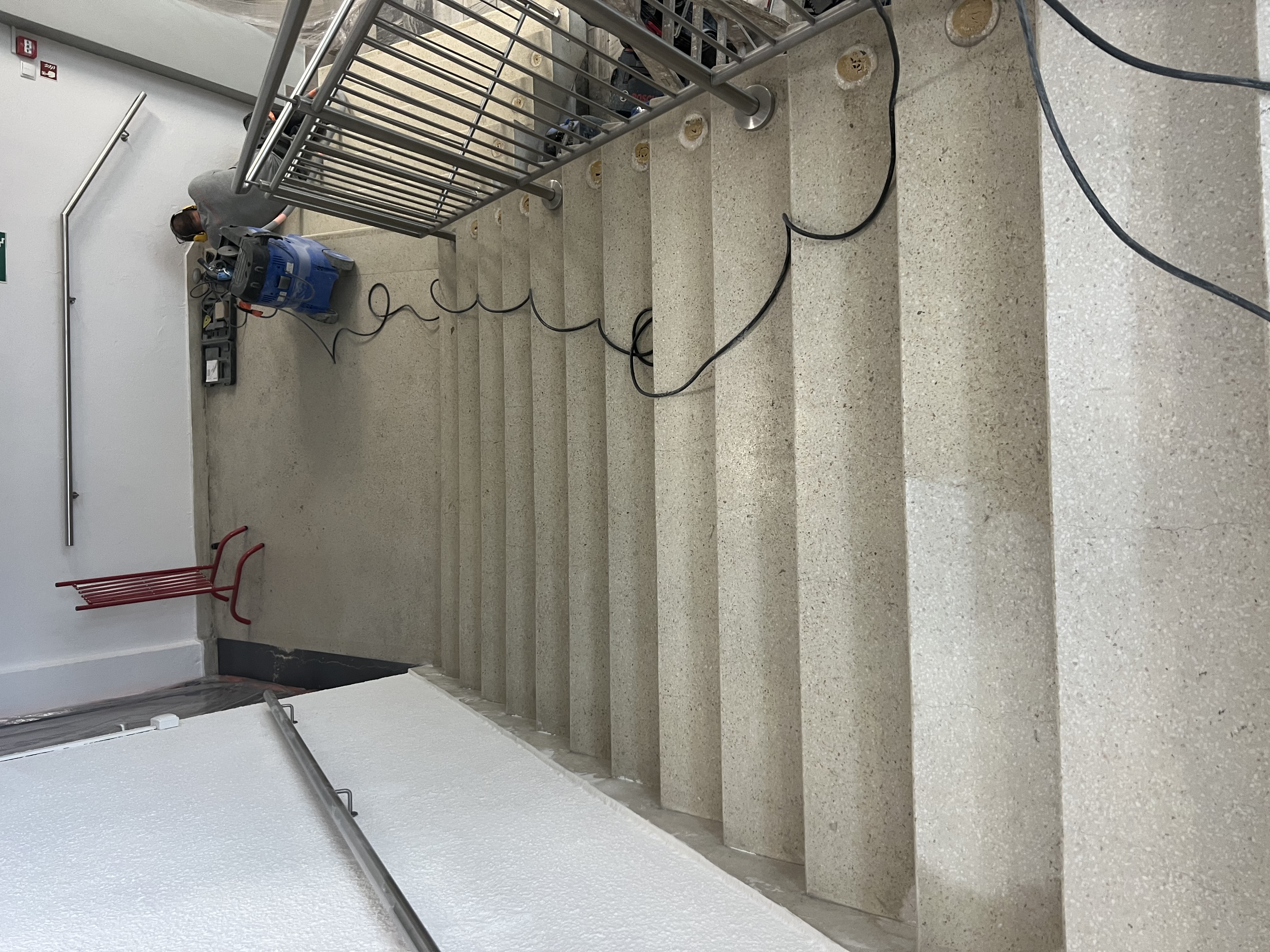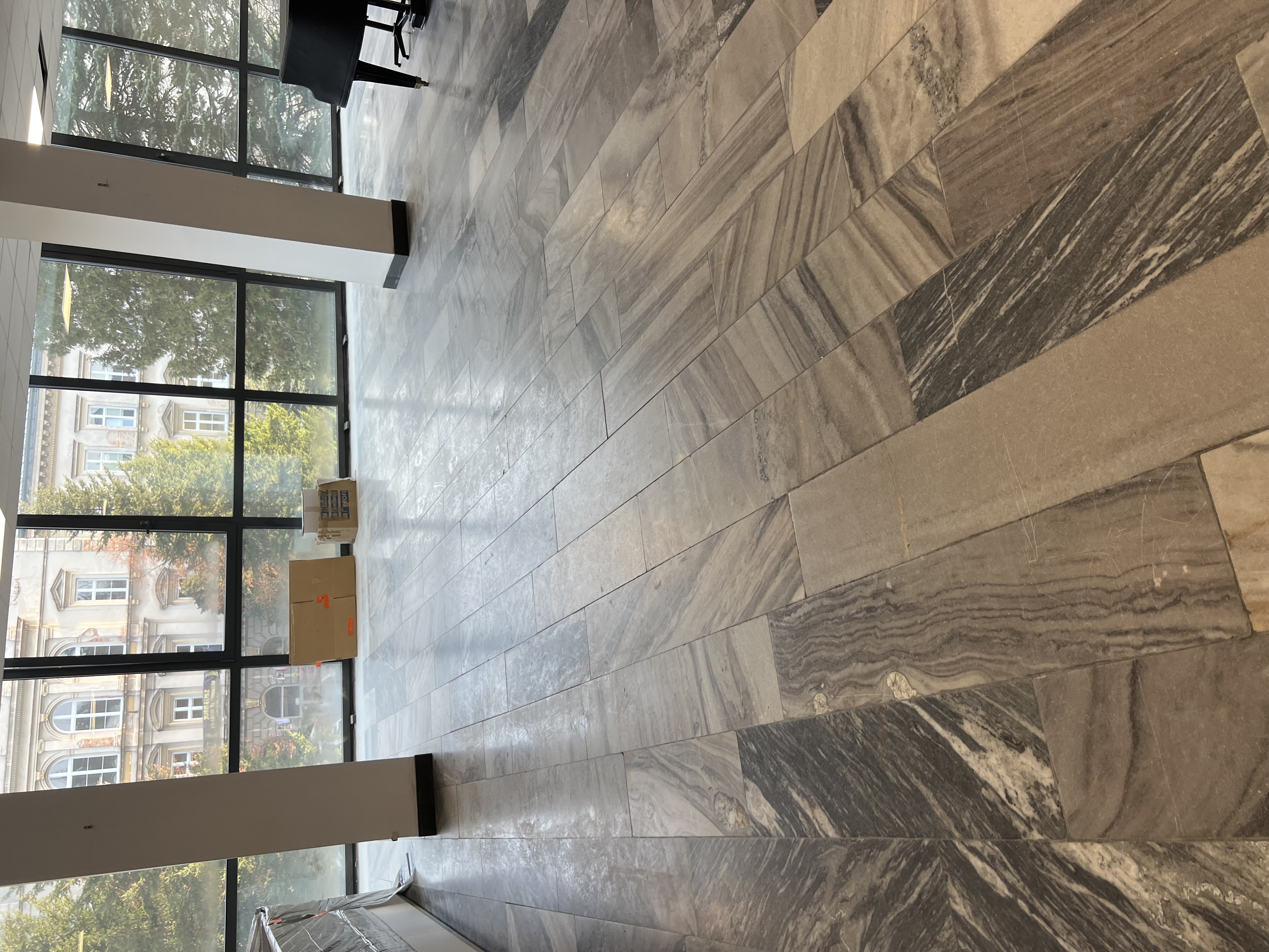 Renowacja dwóch klatek schodowych wykonanych z lastryko oraz polerowanie pasami diamentowymi posadzki marmurowej, 300 m2. Prace wykonana w Książnicy Beskidzkiej - publicznej bibliotece w Bielsku-Białej.