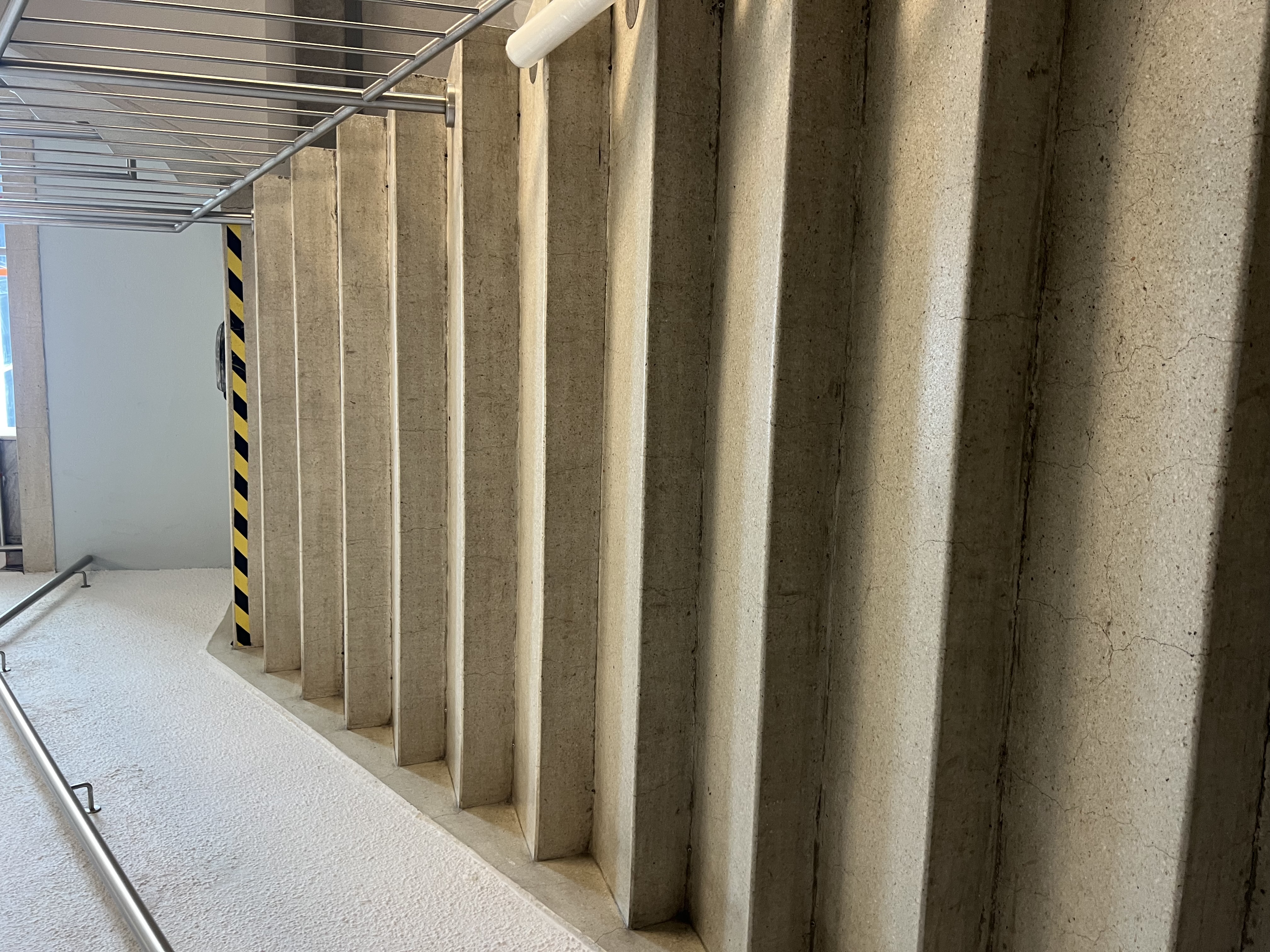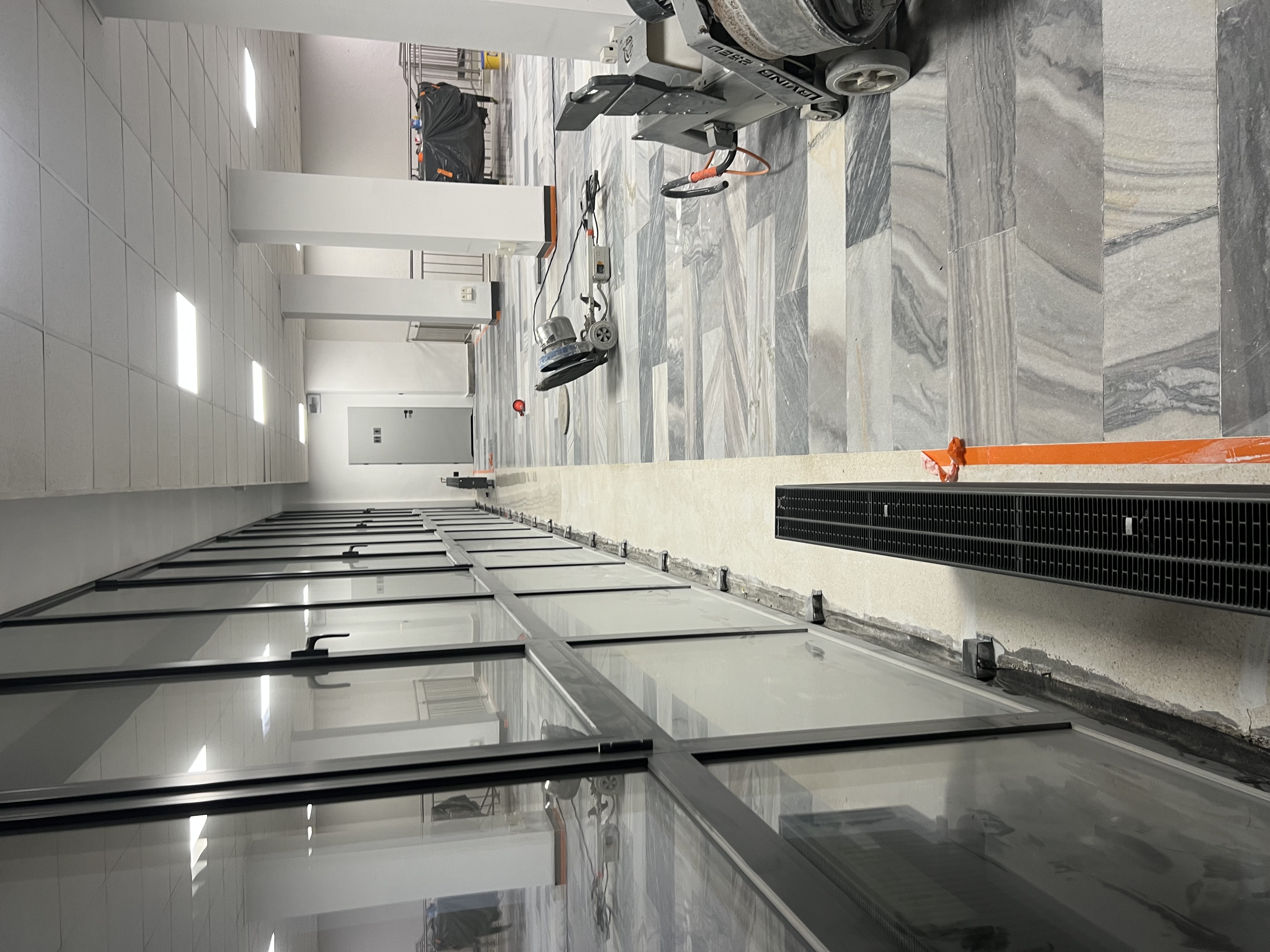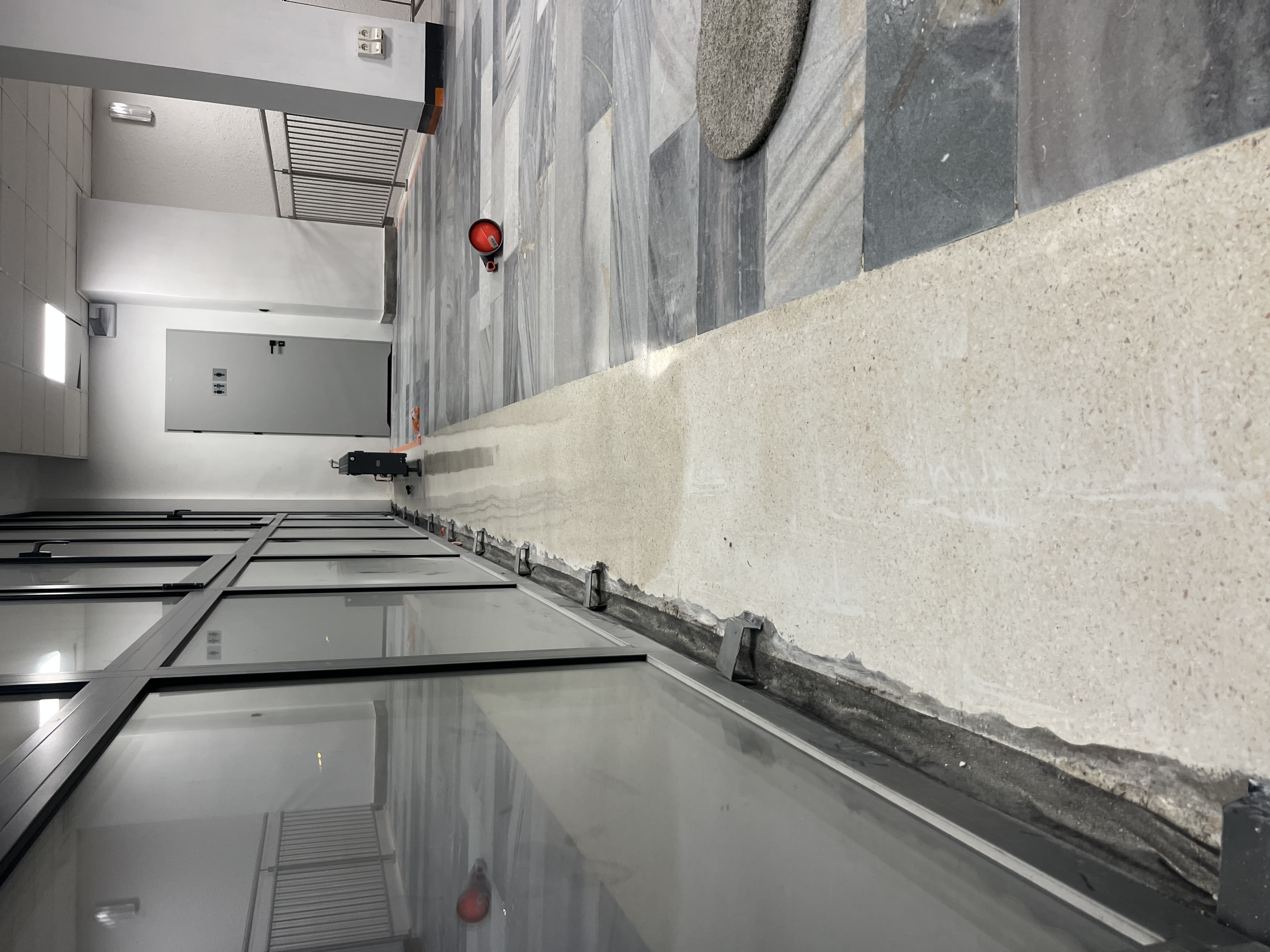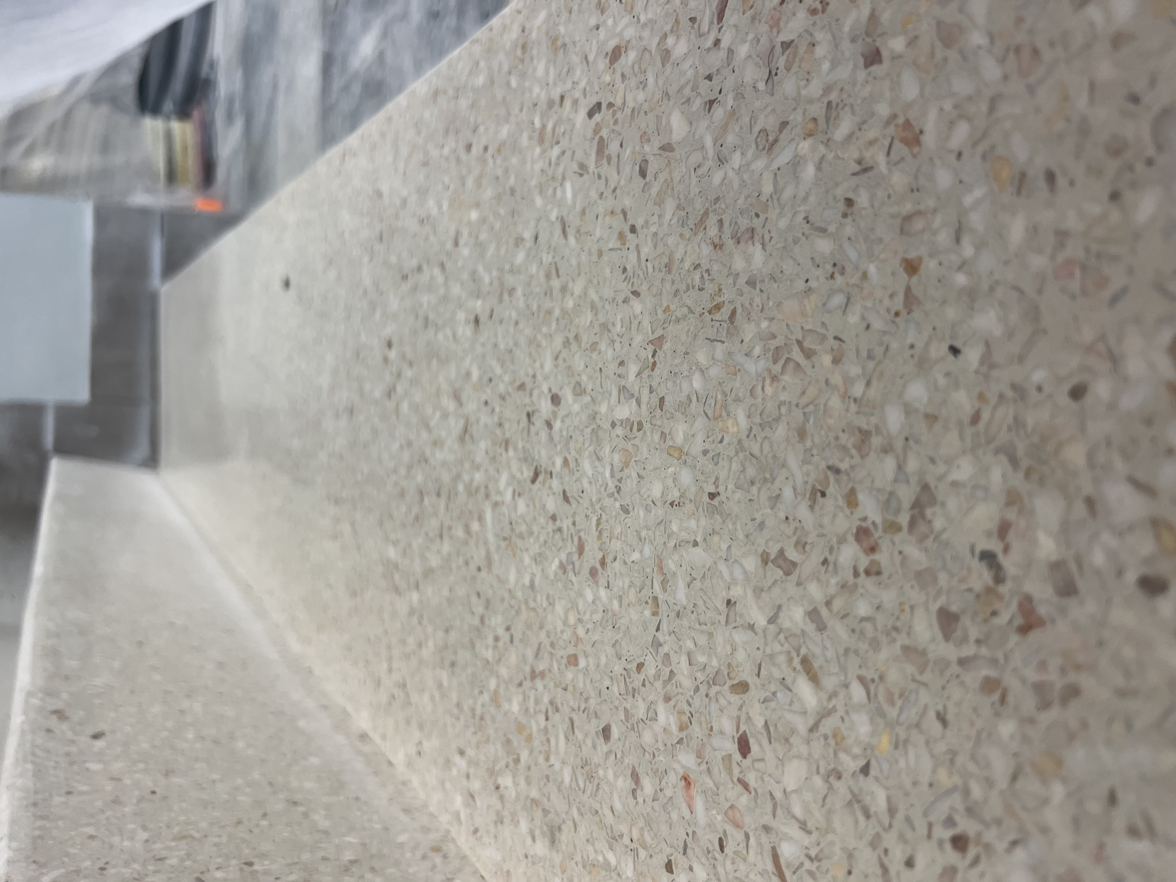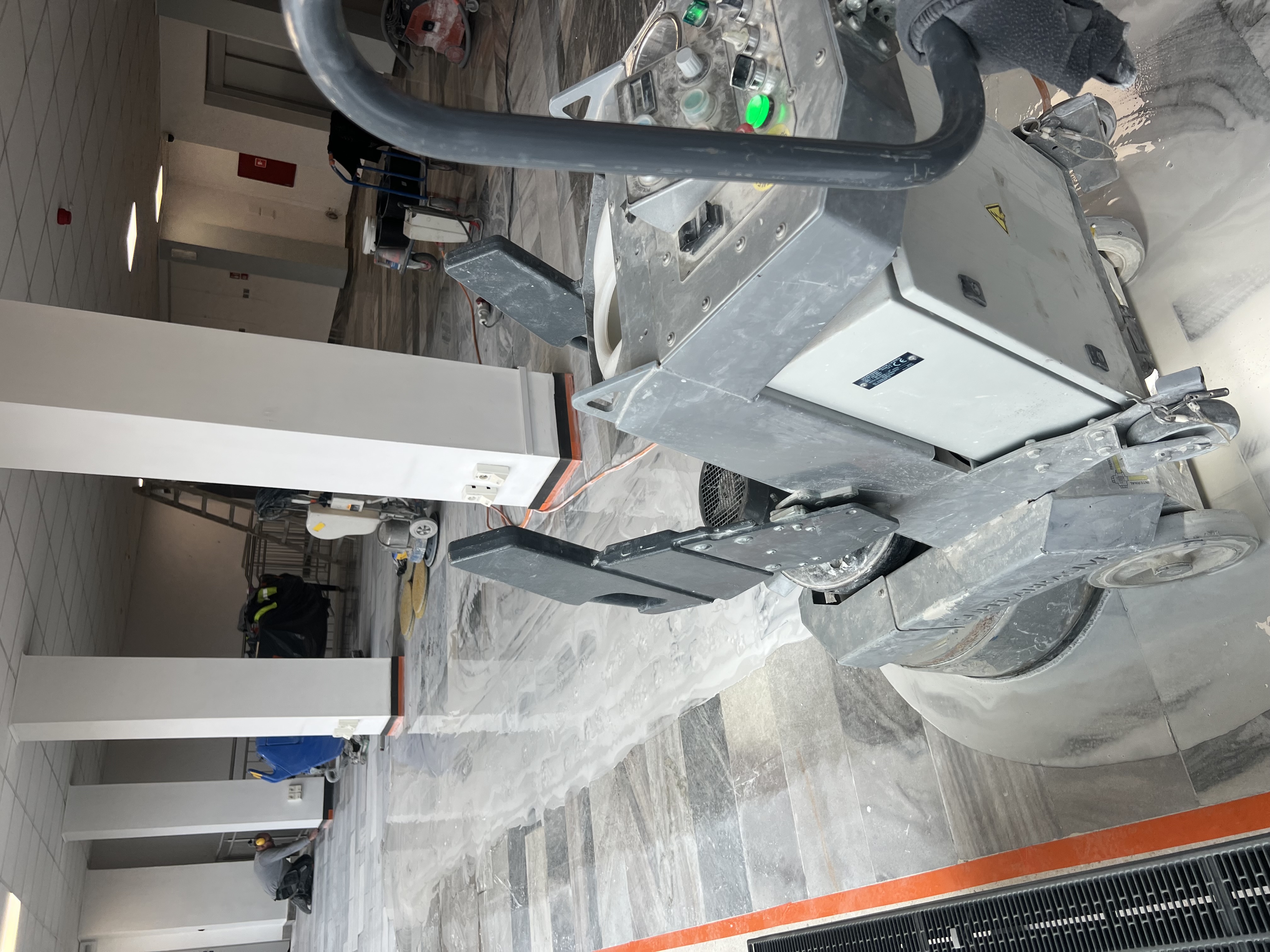 Renowacja dwóch klatek schodowych wykonanych z lastryko oraz polerowanie pasami diamentowymi posadzki marmurowej, 300 m2. Prace wykonana w Książnicy Beskidzkiej - publicznej bibliotece w Bielsku-Białej.